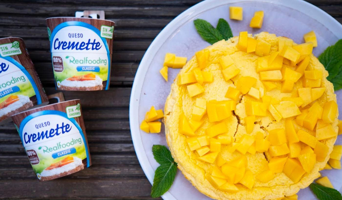 Para un acabado más brillante y tropical, cubre la tarta con una fina capa de puré de mango fresco antes de servir.