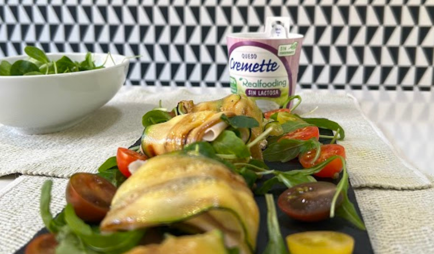 Unta una fina capa de Cremette Classic o Sin Lactosa sobre cada lámina de calabacín. Coloca encima una loncha de pavo y unas hojas de berros.